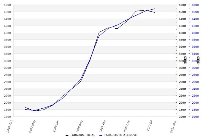 La siguiente tabla compara la evolución del paro total y el desestacionalizado, corrigiendo el efecto calendario (CVE):