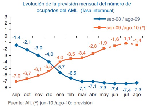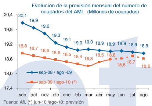 Por otro lado, el indicador laboral que elabora Agett junto a analistas Financieros Internacionales (Afi) avanza que la ocupación podría crecer de forma intertrimestral y reducir ligeramente la tasa de paro hasta el 19,6% en el segundo trimestre de 2010. Sin embargo, avanza que agosto volverá a saldarse con una caída del empleo.