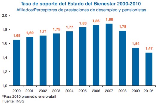 Desde que comenzó la crisis en 2007, la Tasa de Sostenibilidad del Sistema de Bienestar (TSSB) -número de afiliados por cada perceptor de prestación por desempleo o jubilación- se ha venido reduciendo "drásticamente". En el acumulado de 2007 había casi dos afiliados por cada persona perceptora de prestación por desempleo o jubilación. A partir de ese momento, se ha venido reduciendo considerablemente año tras año (1,78 en 2008 y 1,54 en 2009) hasta llegar al 1,47 actual.
