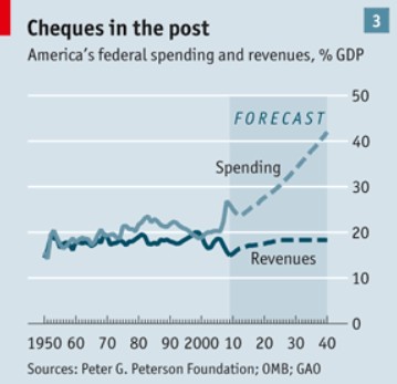 El Congressional Budget Office de EEUU ha calculado que las obligaciones del Estado pasarán del 9% del PIB al 20% en 2050. Según The Economist, la presión del envejecimiento de la población puede hacer que los gobiernos se planteen preguntas fundamentales, como si tiene sentido permitir que la gente se retire a los 65 cuando es probable que viva otros 20 años.