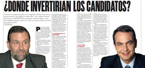 Esta publicación se interesó por el patrimonio y las preferencias de inversión de Mariano Rajoy y de José Luis Rodríguez Zapatero, ambos candidatos a la presidencia del Gobierno. Según la información de aquella publicación, el candidato socialista tenía dos planes de pensiones. Concretamente uno de SCH Renta Fija Mixta y otro SCH Renta Variable Mixta.