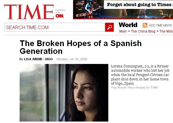 De este modo, Time explica cómo las generaciones de jóvenes trabajadores españoles afrontaron el nuevo milenio con grandes esperanzas de mejorar en su futuro, el pasado de sus padres. El resultado, tras la crisis de competitividad y empleo en nuestro país, es que muchos han tenido que renunciar a la independencia y volver al hogar familiar mientras mantienen la esperanza de encontrar un nuevo empleo.