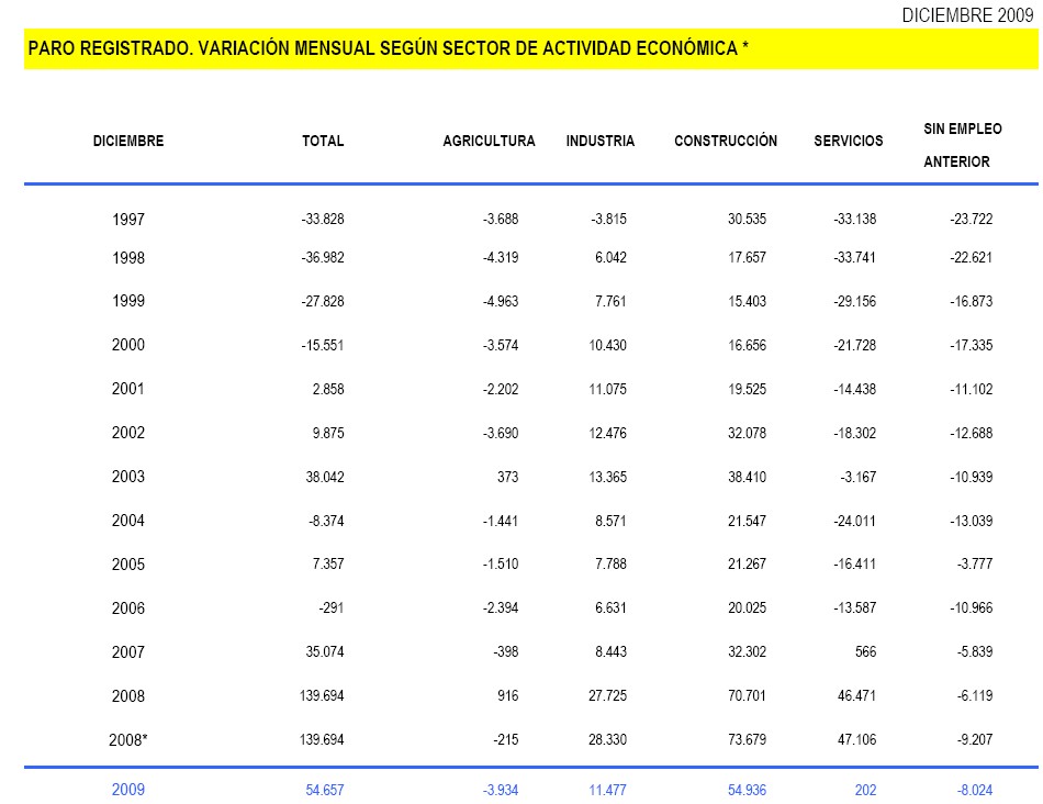 También se registraron alzas del paro en todos los sectores económicos, aunque, en términos absolutos, fueron los servicios y la construcción los que se llevaron la peor parte, al ganar 450.789 y 124.288 parados más, respectivamente. De ambos sectores, el de la construcción es el que ha registrado un mayor aumento del número de desempleados en el pasado mes de diciembre respecto a Octubre.