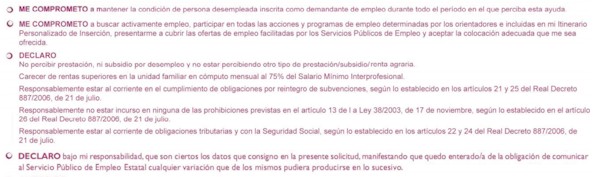 De hecho, para que no haya dudas, en las últimas páginas de la Resolución publicadas por el BOE se incluye un ejemplo de formulario para solicitar la prestación. Este documento (ver imagen debajo) acaba con una serie de apartados que comienzan con la fórmula "Me comprometo" o "Declaro", y que el desempleado tendrá que firmar. Entre estas cláusulas de obligado cumplimiento está la frase anteriormente referida: "Aceptar la colocación adecuada".