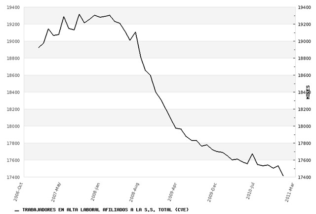 Pues bien, algo similar ha acontecido, igualmente, con los datos de afiliación a la Seguridad Social, que sirven para medir la destrucción o desaparición de puestos de trabajo. La Seguridad Social cerró enero con un descenso medio de 223.143 afiliados respecto a diciembre (-1,27%), con lo que el total de ocupados, en términos promedios, se situó en 17.361.839 cotizantes. El retroceso de enero es inferior a los descensos que se registraron en los mismos meses de 2010 y 2009, cuando la afiliación cayó en 257.828 y 349.569 ocupados, respectivamente.