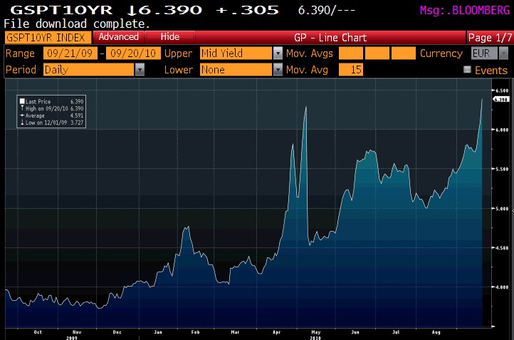 En el siguiente gráfico se observa cómo ambos países están siguiendo la senda de Grecia, cuya quiebra fue evitada por el momento gracias a un rescate de 110.000 millones de euros por parte del la UE y el FMI.