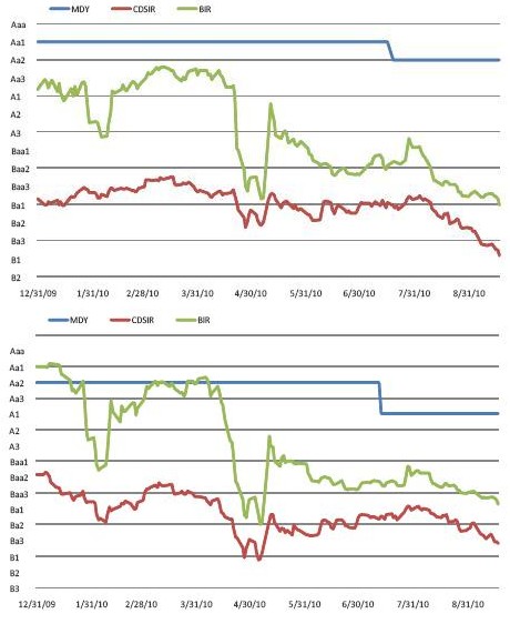 De hecho, en la actualidad, la deuda pública de Irlanda y Portugal cotiza en el mercado a nivel de bono basura. En concreto, los inversores otorgan un rating (nota de calidad crediticia) de Ba1 a Irlanda y de B1 a Portugal, atendiendo a su prima de riesgo, muy alejados pues del Aa2 y el A1, respectivamente, que aún mantiene la agencia de calificación Moody´s.