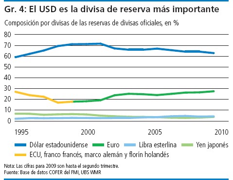 Pese a ello, UBS advierte de que, "dados los profundos problemas económicos de EEUU y la demanda general de una cartera de divisas más diversificada entre inversores públicos y privados, esperamos que disminuya la proporción de dólares en las carteras internacionales". "Los bancos centrales buscarán diversificar sus reservas de divisas", incide. En resumen, "creemos que el dólar estadounidense puede ir perdiendo lentamente su dominio absoluto".