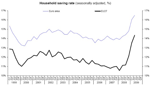 La tasa de ahorro de los hogares de la eurozona se situó en el segundo trimestre en el 16,5%, medio punto más que en el primer trimestre (16%), mientras que en la Europa de los 27 se incrementó nueve décimas hasta el 14,4%. Se trata de la mayor tasa de ahorro desde que existen mediciones a nivel comunitario (1999).