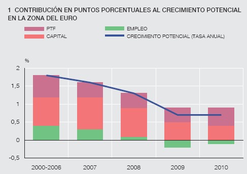 Por último, según las últimas estimaciones de la Comisión Europea (CE), la crisis podría reducir a más de la mitad el crecimiento potencial del área del euro en 2008-2010, desde tasas próximas al 2% registradas en el período 2000-2006. Es decir, un crecimiento potencial del 1% a medio y largo plazo.