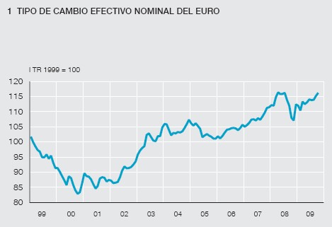 En octubre, el tipo de cambio efectivo nominal del euro se situó en sus máximos históricos, igualando los niveles alcanzados a mediados de 2008. Desde finales del pasado año el tipo de cambio efectivo ha retomado la tendencia apreciadora que venía mostrando desde 2006 y que se había interrumpido a mediados de 2008, coincidiendo con el episodio de fuerte inestabilidad en los mercados financieros globales en el que los activos públicos denominados en dólares llegaron a considerarse como "activos refugio" por parte de los inversores internacionales.