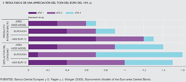 Así, según los modelos que manejan los organismos internacionales, "una apreciación permanente del euro del 10% puede suponer una disminución de la tasa de expansión de la actividad que oscila entre un 0,3% y un 0,7% del PIB al cabo de un año, así como una reducción de la inflación", indica. Además, se estima que la transmisión total a la economía se completaría en torno al tercer año, dando lugar, a una reducción media acumulada del PIB de "entre 0,7% y 1,3%".