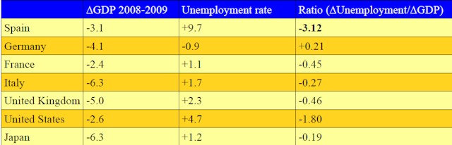 Tal y como se recoge en los dos siguientes cuadros (pinche en la imagen para ampliar), en España la caída oficial del PIB (3,1%) durante este período se ha materializado en un aumento de la tasa de paro de 9,7 puntos, es decir, 3 veces más (una ratio de 3,2). Se trata de un crecimiento inédito en el resto de países analizados, tan sólo se aproxima, y muy de lejos, EEUU con una ratio de 1,8.