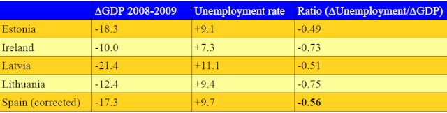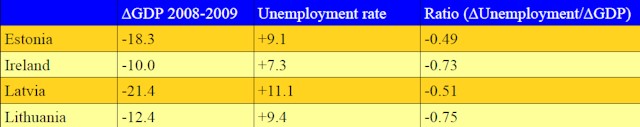 Pero lo más paradigmático llega al analizar la recesión de los países de Europa del Este. Así, el PIB de Estonia decreció un 18,3% mientras que su tasa de paro aumentó en 9,1 puntos, registrando así una ratio desempleo/PIB del 0,49, casi seis veces menos que en España (3,12); lo mismo sucede con Irlanda (-10% del PIB), Letonia (-21,4%) o Lituania (-12,4%).