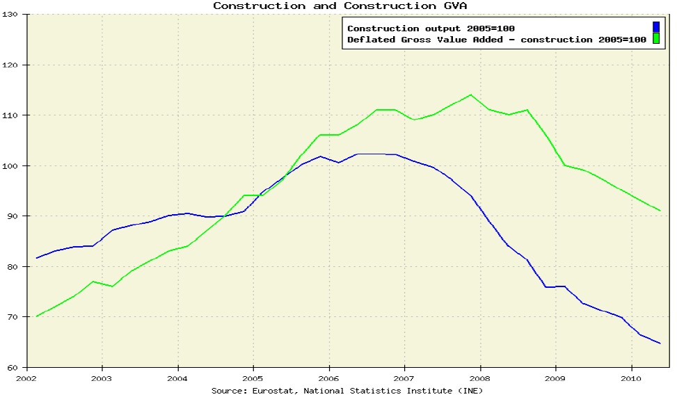 Lo curioso es que se observan discrepancias similares en otros sectores clave como la construcción o la industria. Mientras que el índice de la actividad en la construcción española de desplomó un 29,4% en los dos años previos, el VAB apenas retrocede un 16,7%. Una divergencia sustancialmente mayor a la de la construcción en Francia: -12,7% frente a un -7%, respectivamente. Todo ello, haciendo uso de los datos de Eurostat (homogéneos para todos los países de la UE).