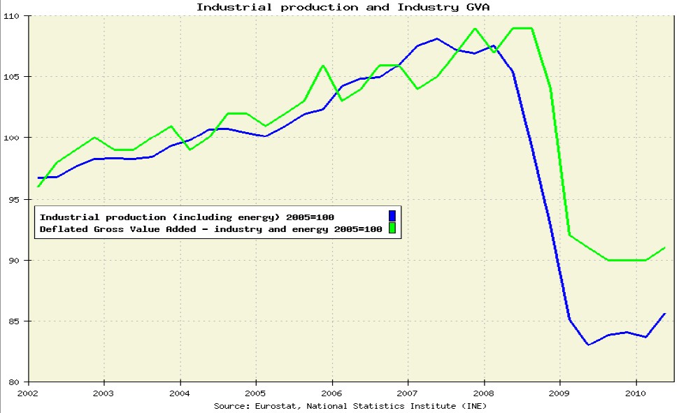 La industria tampoco se salva: el índice de la producción industrial cayó en España un 24,1% en este período mientras que el VAB (deflactado, descontando la inflación) bajó un 14,5%. En Francia, tan sólo cae un 16% y un 14,5%, respectivamente.