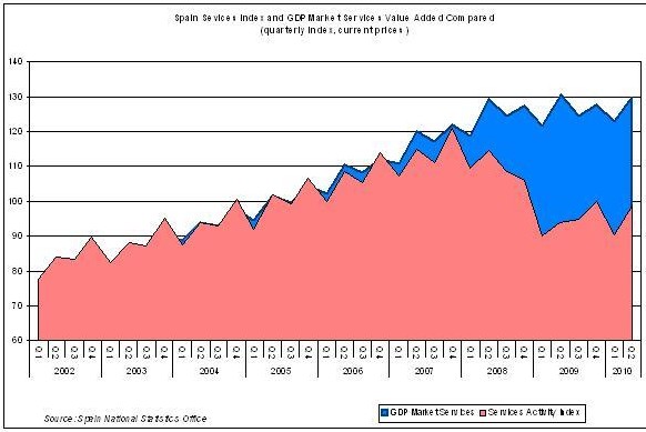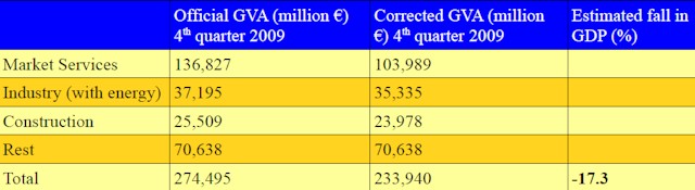 Según Economía, el PIB español habría caído un 3,1% durante los dos pasados años. Sin embargo, el citado informe concluye que la caída real entre finales de 2007 y finales de 2009 asciende al 17,3% del PIB, con lo que el Gobierno habría subestimado, u ocultado, un desplome de 14,2 puntos porcentuales.