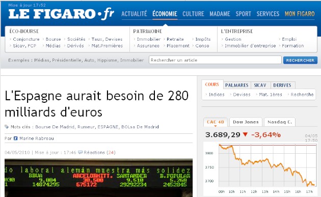 El diario francés Le Figaro llega a asegurar que España necesita 280.000 millones de euros para hacer frente a sus vencimientos de deuda en los próximos meses. Recoge “un rumor que circula en el parqué desde primeras horas de la mañana”. De hecho señala que “España podría pedir ayuda al FMI” y que “Zapatero ha logrado detener el incendio”, una visión demasiado optimista a tenor del cierre del mercado español.