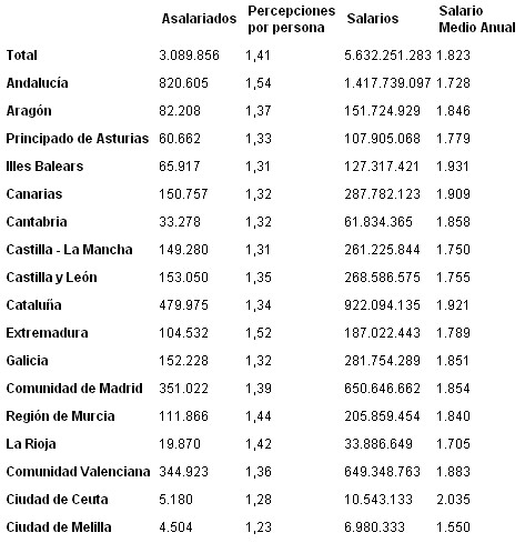 El salario medio anual de estas más de 800.000 personas andaluzas se sitúa en 1.728 euros anuales, es decir, menos de 150 euros al mes. Menos de 5 euros al día. Los datos están referidos al ejercicio de 2008 y el tramo de salario examinado es el que va de 0 a 0,5 veces el Salario Mínimo Interprofesional. Que alguien diga que la concertación empresario-sindical en Andalucía ha resultado ser un éxito, es sencillamente bochornoso. No sabemos para qué sirve dicha concertación. Para resolver los problemas del empleo y los salarios más bajos, desde luego que no. Tras casi 30 años de gobiernos socialistas, esta es la situación real de los más débiles en Andalucía y deja intuir una oscura cortina de economía sumergida.