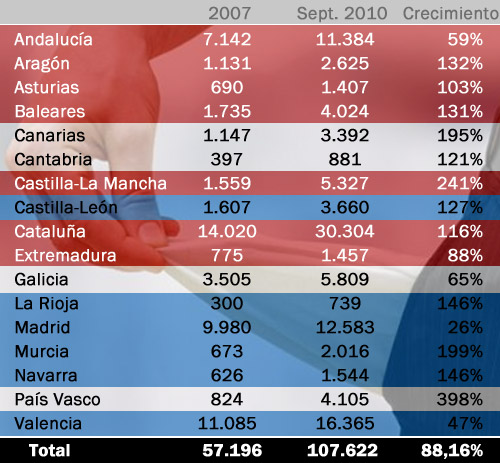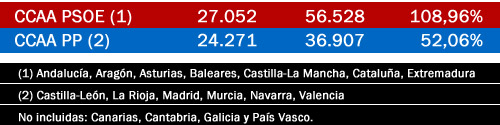 Desde diciembre de 2007 a la actualidad (es decir, en los tres años de crisis), las siete autonomías regidas por gobiernos del PSOE (Andalucía, Aragón, Asturias, Baleares, Castilla-La Mancha, Cataluña, Extremadura) han visto crecer su deuda en un 108%. Mientras, las seis del PP (Castilla-León, La Rioja, Madrid, Murcia, Navarra, Valencia) han incrementado sus números rojos un 52%. Es decir, que en la foto las regiones socialistas no salen demasiado bien paradas.