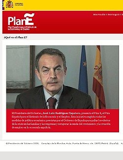 (Libertad Digital) En este vídeo de cuatro minutos, colgado en la nueva página (http://www.plane.gob.es/), Zapatero asegura que el principal objetivo del Ejecutivo es luchar contra el desempleo y volver a una senda de recuperación de puestos de trabajo, así como lograr que la economía española salga "fortalecida" de esta situación. Y ello, pese a que los datos anticipan que España sufrirá la peor recesión económica de los últimos 50 años.