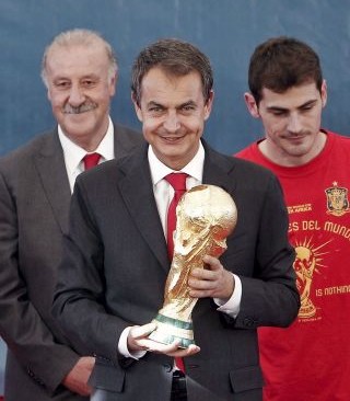 ¡Qué bien le ha venido al presidente del Gobierno la victoria mundialista de la selección! La recepción que hizo a los jugadores en el Palacio de la Moncloa fue uno de los momentos más felices de la vida de Zapatero. Cogió el trofeo, abrazó hasta al utillero y se jactó de ser el gran timonel que ha guiado a la "marea roja" hacia el triunfo. Se notaba que los más cercanos al estrado eran simpatizantes socialistas, ya que nadie lanzó improperios al presidente ni le echó en cara la nefasta política que ha hundido la economía española.