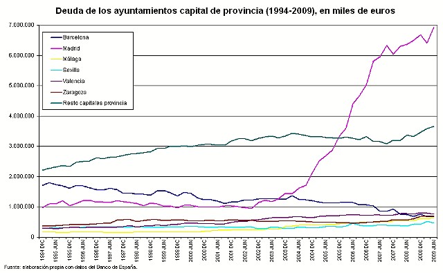 La deuda de la ciudad de Madrid se acerca a los 7.500 millones de euros. No sólo es la mayor de todos ayuntamientos españoles, sino que también es superior a la de todas las comunidades autónomas a excepción de Valencia y Cataluña. En porcentaje de los ingresos está en el entorno del 150% (los presupuestos de 2010 preveían 4.900 millones de euros), el doble del 75% permitido por el Gobierno a las corporaciones municipales para emitir nueva deuda. Por eso, desde que Elena Salgado realizara el anuncio de que sólo las corporaciones más solventes podrán emitir nueva deuda, Ruiz Gallardón ha sido el alcalde más belicoso contra la medida.