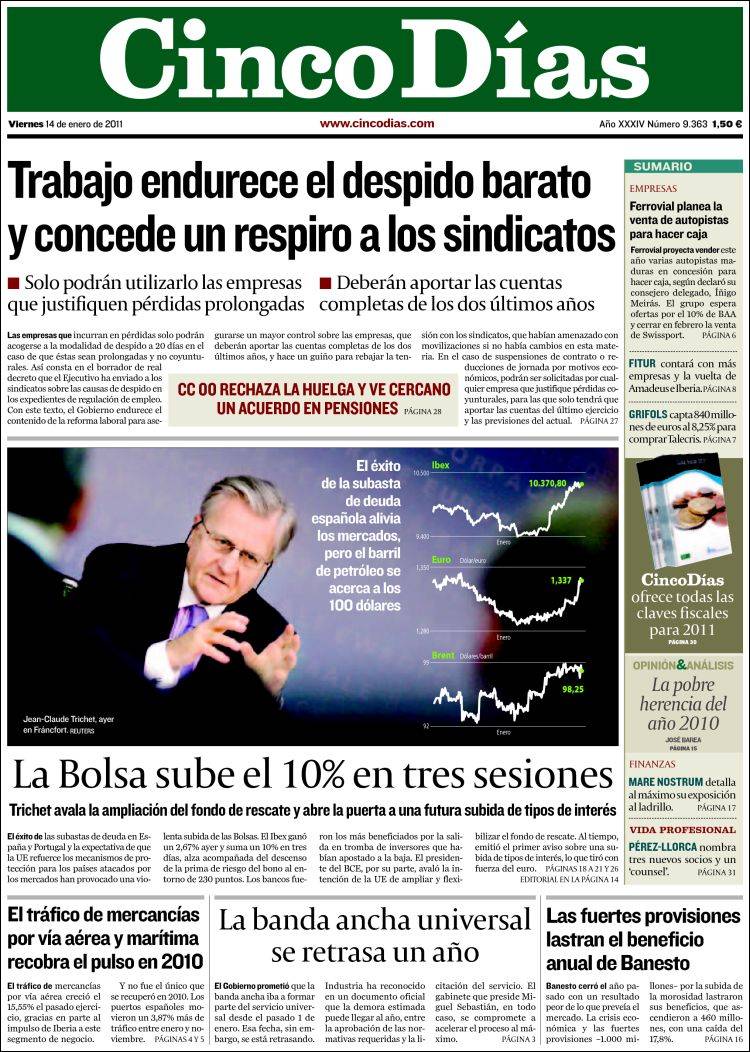 Por su parte, Cinco Días explica que "Trabajo endurece el despido barato y concede un respiro a los sindicatos". La indemnización de 20 días por año trabajado "sólo podrán utilizarla las empresas que justifiquen pérdidas prolongadas" y "deberán aportar las cuentas completas de los dos últimos años". Justo debajo de esta información de portada, el periódico de Prisa anuncia que "CCOO rechaza la huelga y ve cercano un acuerdo en pensiones".