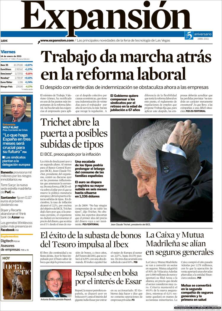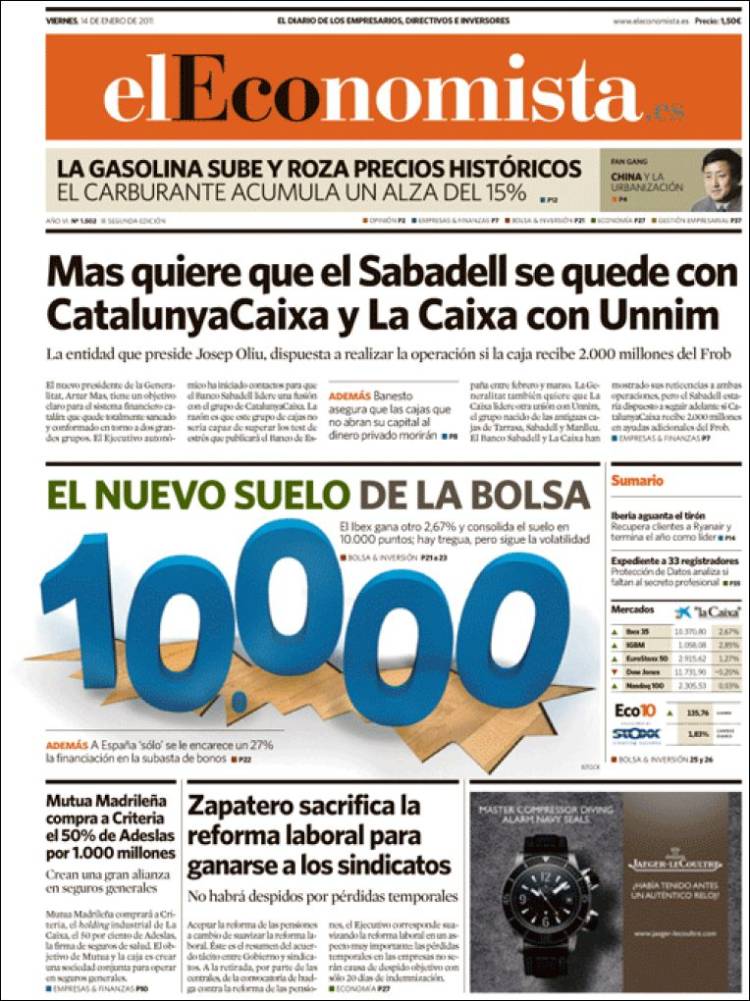 En cuanto a El Economista, en primera página considera que "Zapatero sacrifica la reforma laboral para ganarse a los sindicatos": no habrá despidos por pérdidas temporales. "Las constantes amenazas de CCOO y UGT de convocar una nueva huelga general, al final, han dado sus frutos":