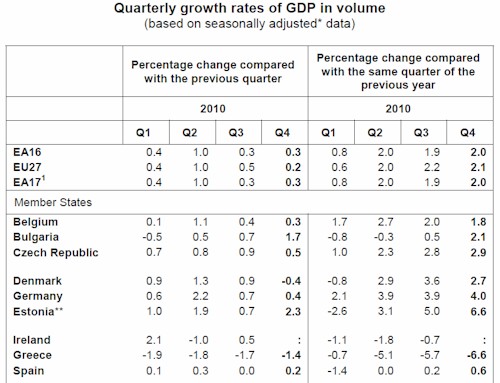 Así, según la oficina estadística de la UE (Eurostat), la Europa de los 27 creció de media un 0,2% intertrimestral en el cuarto trimestre, al igual que España, ligeramente por debajo de la zona euro (0,3%). Éste es, precisamente, el dato que ha escogido Zapatero para lanzar su mensaje.