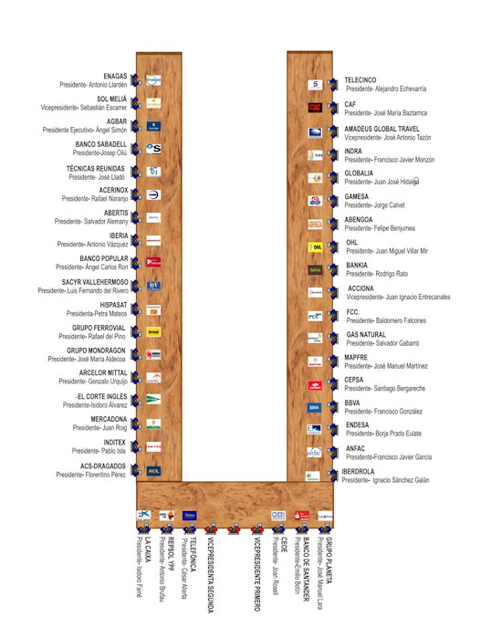 Poco después de las 09:30 horas empezaron a llegar los empresarios y uno de los más madrugadores fue el presidente de ACS-Dragados, Florentino Pérez, también de los primeros en someterse a los flashes de los medios gráficos. Poco después entraron el presidente de la CEOE acompañado de Isidro Fainé, presidente de La Caixa; César Alierta (Telefónica); Isidro Álvarez (El Corte Inglés); José Manuel Lara (Planeta), José Manuel Martínez (Mapfre); Pablo Isla (Inditex); Rodrigo Rato (Bankia) y Petra Mateos-Aparicio (Hispasat), entre otros.