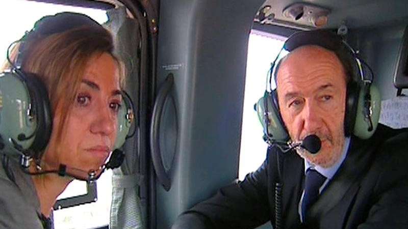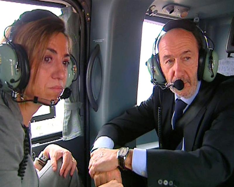 Imagen facilitada por TVE del vicepresidente primero del Gobierno y ministro de Interior, Alfredo Pérez Rubalcaba, y la ministra de Defensa, Carme Chacón, sobrevolando Lorca a bordo de un helicóptero.