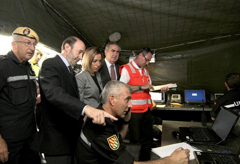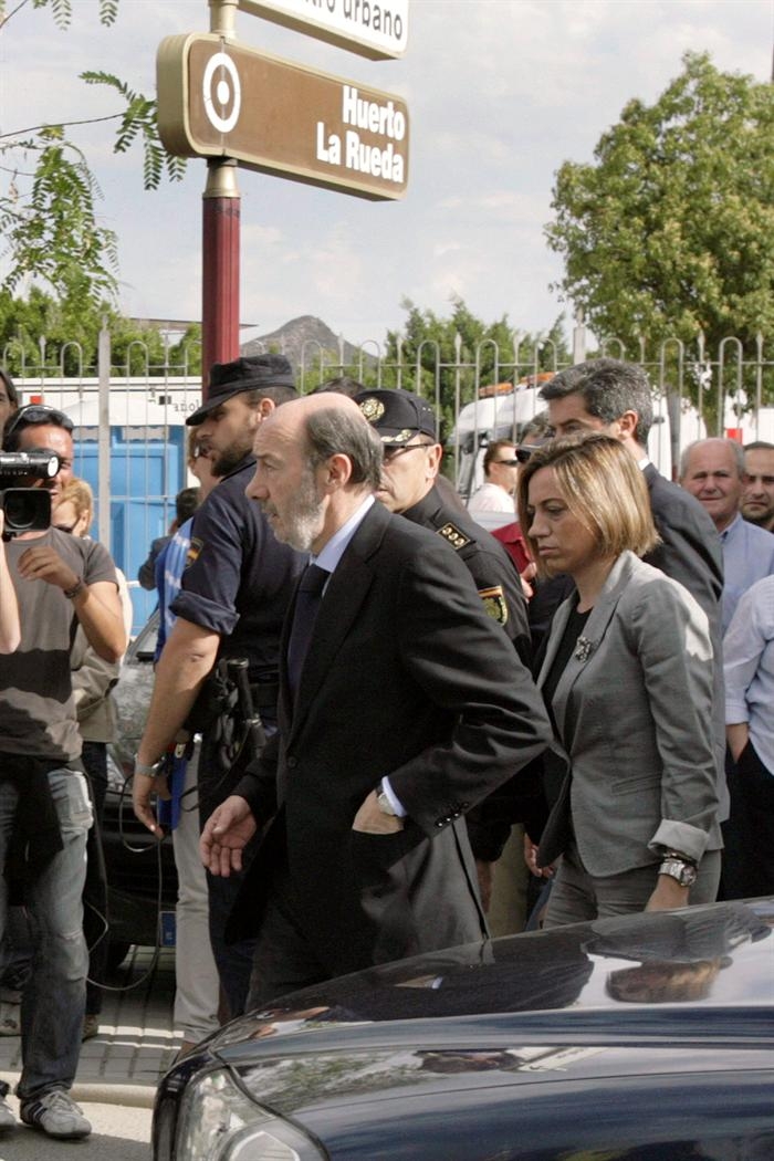 Los ministros del Interior, Alfredo Pérez Rubalcaba, y Defensa, Carme Chacón, durante su visita al Huerto de la Rueda, en Lorca, donde está instalado el mando operativo del terremoto de 5,2 grados en la escala de Richter que afectóa Lorca.