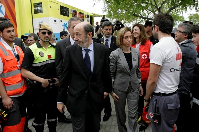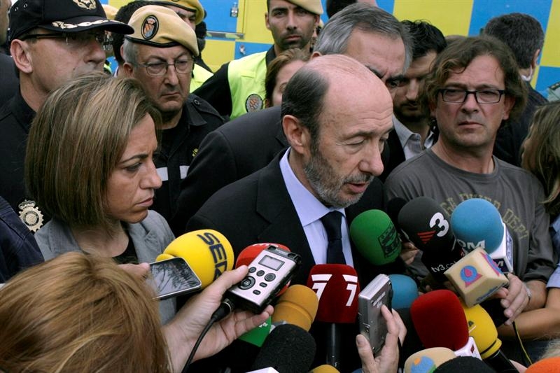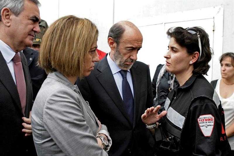 Los ministros del Interior, Alfredo Pérez Rubalcaba, y Defensa, Carme Chacón, responden a las preguntas de los periodistas durante su visita al Huerto de la Rueda, en Lorca, donde está instalado el mando operativo.