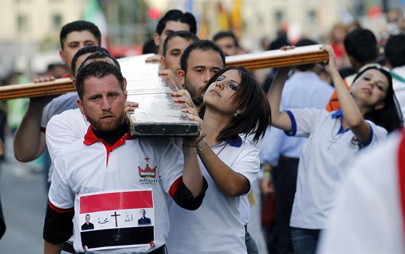 Jóvenes llevaron la cruz de la JMJ por las calles de Madrid, en algunos casos el momento tenía especial significación, como en el de estos que llegaban de Irak