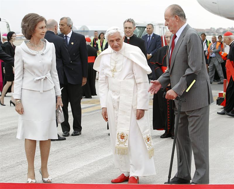 Benedicto XVI fue recibido por don Juan Carlos y doña Sofía en la misma pista de Barajas