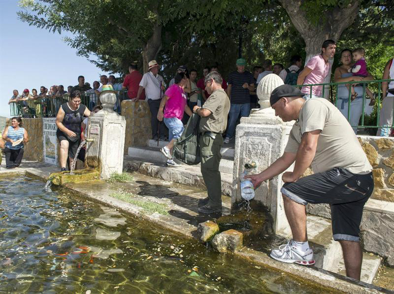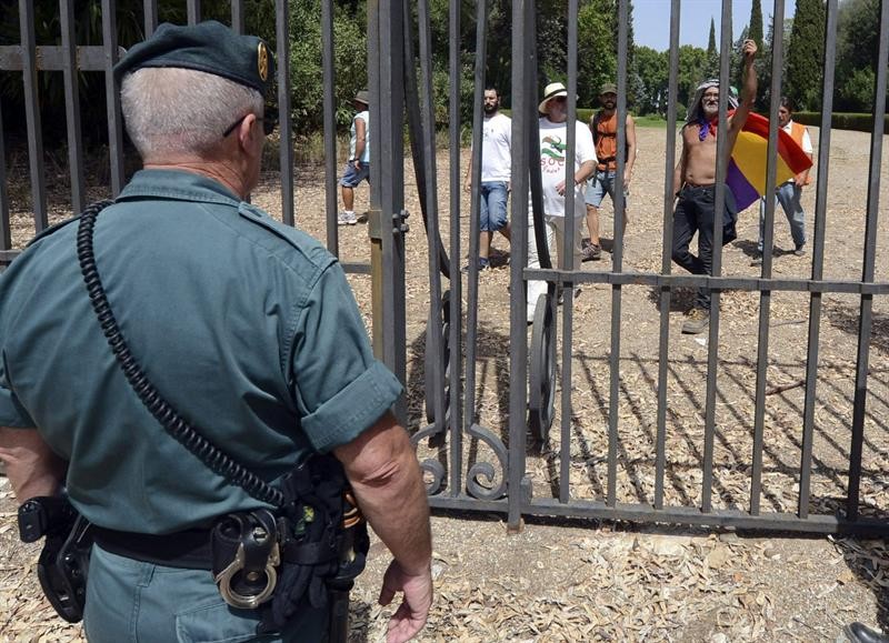 Un guardia civil observa a los jornaleros en los jardines del Palacio de Moratalla