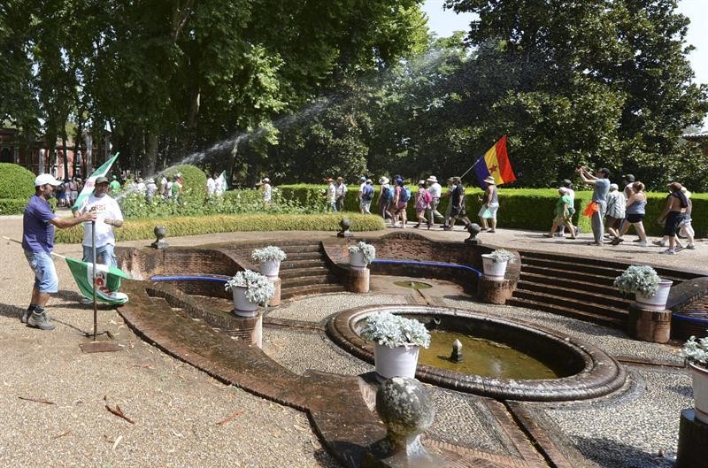 Sindicalistas juegan con las fuentes que adornan los jardines.