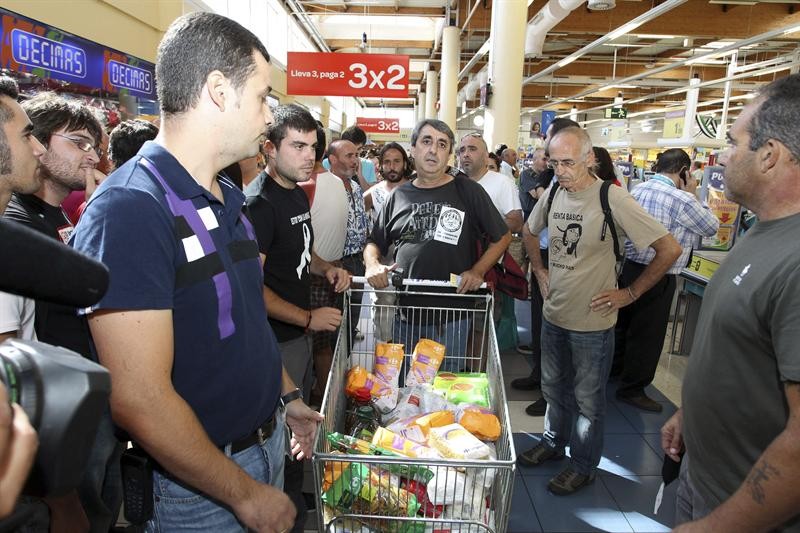 El diputado de IU en la Asamblea de Extremadura Víctor Casco, y el excoordinador general de la coalición en la región Manuel Cañada (c), han acudido a un Carrefour a apropiarse de comida.