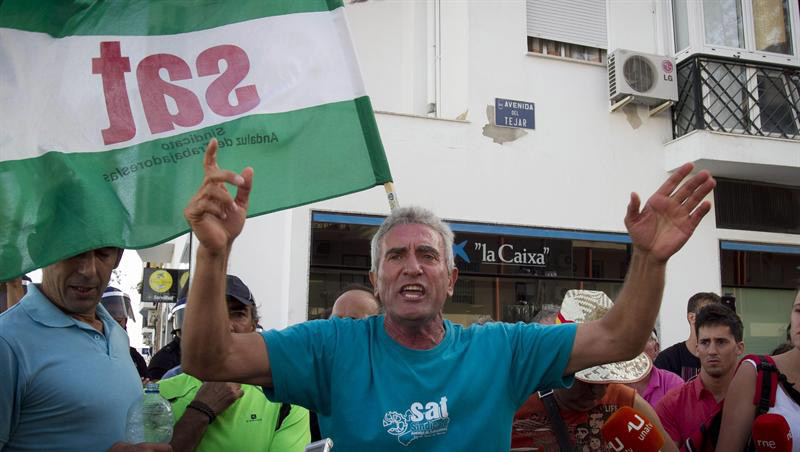 El portavoz del SAT, Diego Cañamero, a las puertas de la oficina de La Caixa que ha sufrido otra de sus ocupaciones