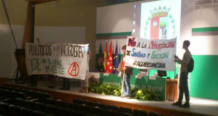 La Facultad de Medicina de la Universidad Autónoma de Madrid albergó este lunes el encuentro que finalmente tuvo que ser suspendido por la presencia de un centenar de personas -entre ellos profesores y estudiantes- que no cejaron de gritar y pitar consignas como "Esperanza, muérete". Un grupo de alumnos, además, portaba una pancarta donde se podía leer "Políticos, a la hoguera" así como el mismo lema dirigido a la presidenta, que también corearon.