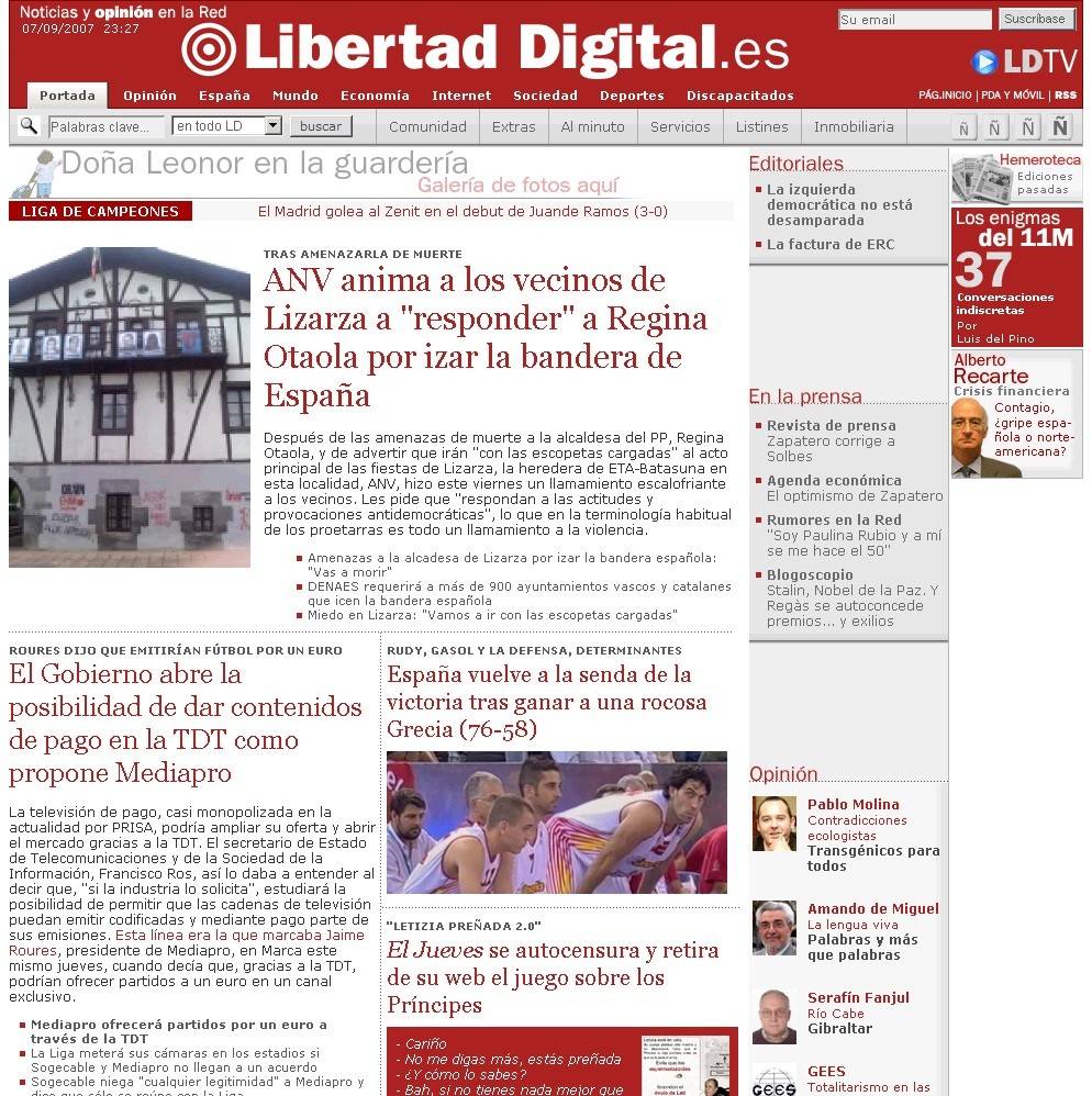 Tal día como hoy, el 7 de septiembre, pero de 2007, Libertad Digital llevaba en su portada la enésima amenaza de los proetarras a la alcaldesa de Lizarza. Regina Otaola llegó a la alcaldía tras la victoria en las urnas en mayo de 2007 y fue ese 7-S cuando tiró de casta para, durante las fiestas de la localidad guipuzcoana, izar la bandera de España por primera vez en el Ayuntamiento y en el salón de plenos desde el año 1977.