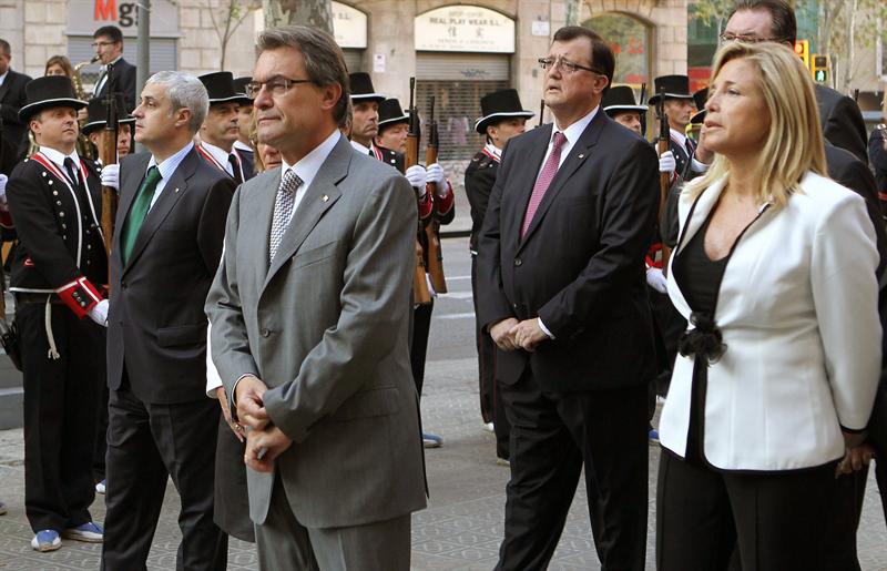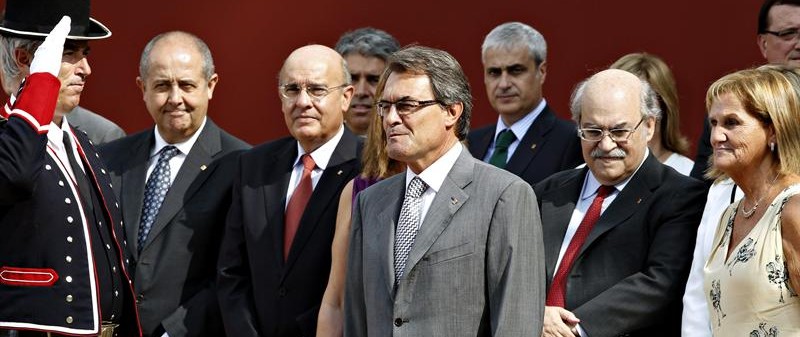 El presidente de la Generalitat, Artur Mas (c), junto con el gobierno catalán durante la ofrenda floral en el monumento a Rafael de Casanovas