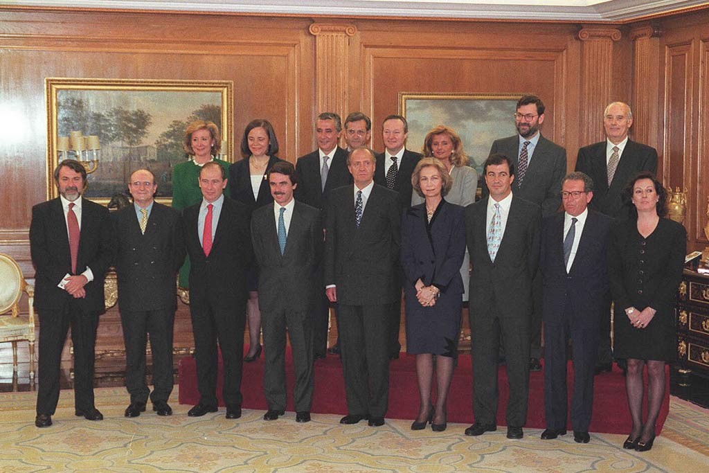 El Rey posa junto a José María Aznar y su primer Gobierno en 1996. Entre ellos se encontraba Esperanza Aguirre, ministra de Cultura