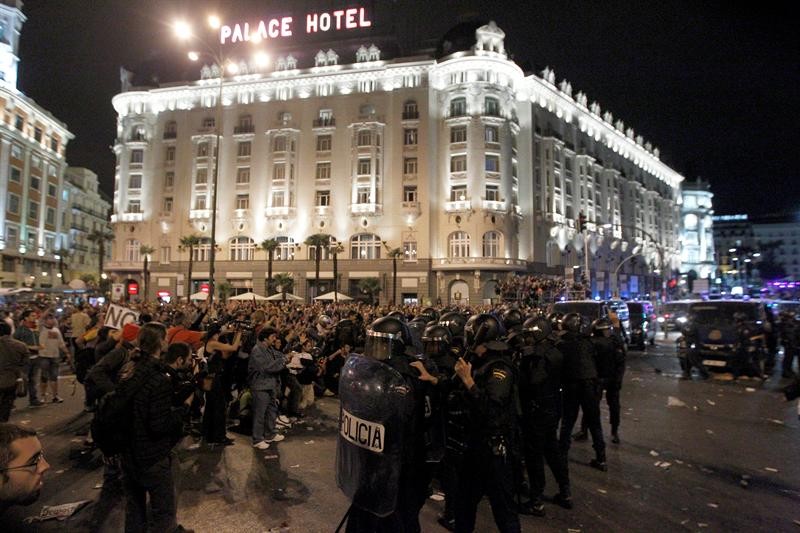 Manifestantes se enfrentan a la Policía en la plaza de Neptuno el pasado martes