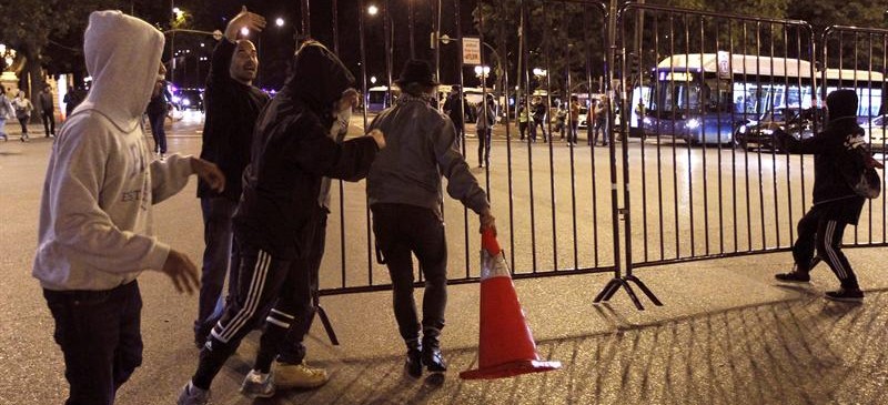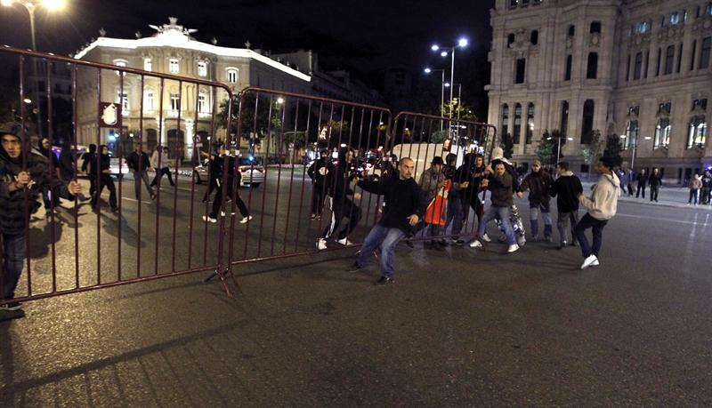 Un reducido grupo de radicales intenta derribar las vallas situadas en la Plaza de Cibeles