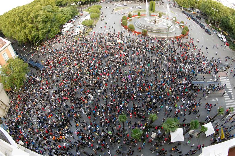 Varios de los participantes en la concentración en la Plaza de Neptuno, en Madrid, ante los agentes de la policía