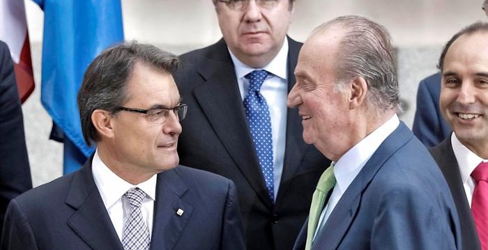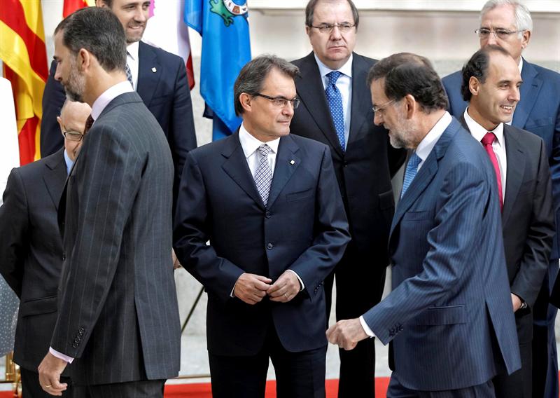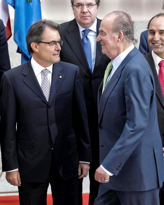 El rey Juan Carlos, junto al presidente de la Generalidad de Cataluña, Artur Mas, momentos antes de posar con los 19 mandatarios de comunidades y ciudades autónomas, en la foto de familia