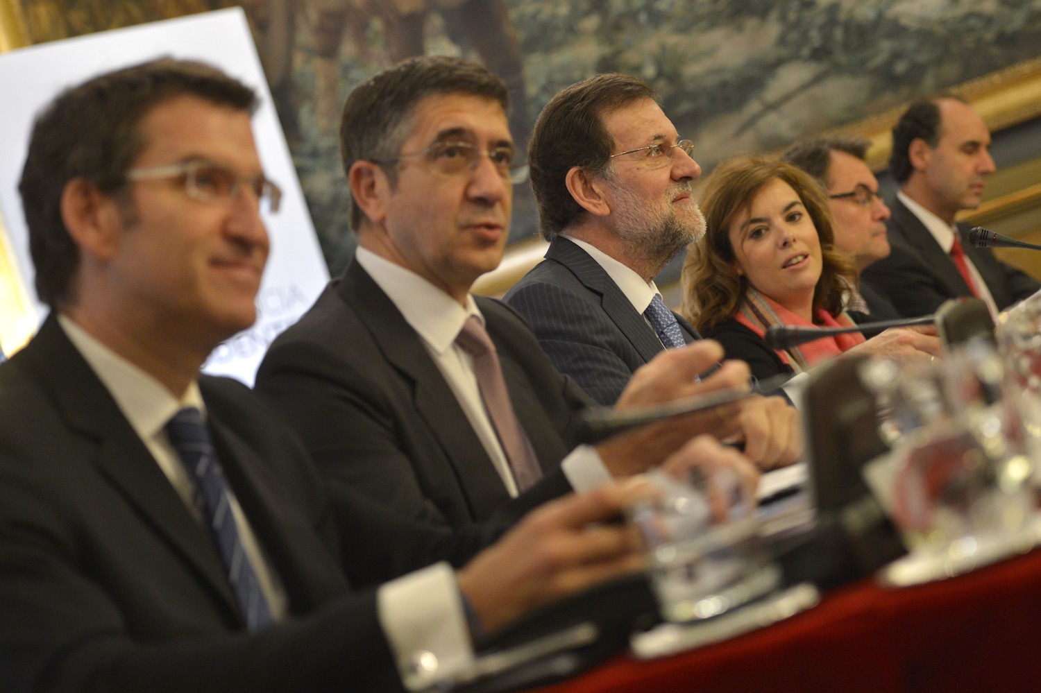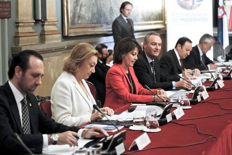 Los presidentes (de izda a dcha), de Baleares, José Ramón Bauzá; de Aragón, Luisa Fernanda Rudi; de Navarra, Yolanda Barcina; de la Comunidad Valenciana, Alberto Fabra; de La Rioja, Pedro Sanz, y de Andalucía, José Antonio Griñán