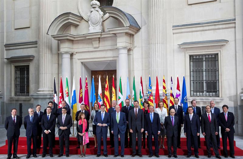 El rey Juan Carlos, junto al príncipe de Asturias y el presidente del Gobierno, Mariano Rajoy, posa con los 19 mandatarios de comunidades y ciudades autónomas, en la foto de familia de la V Conferencia de Presidentes que se celebra hoy en el Palacio del Senado